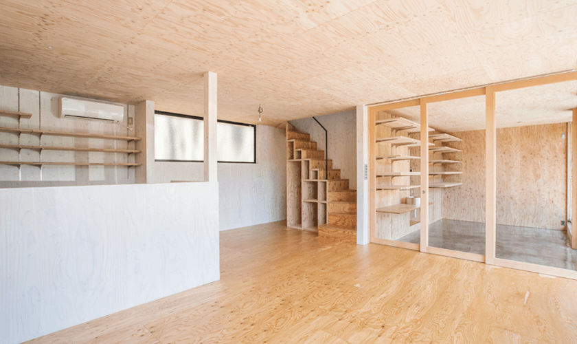 屋根と外壁は、軽量で耐震性にも優れているガルバリウム鋼板に、内装は全面的に構造用合板を使用しました。
